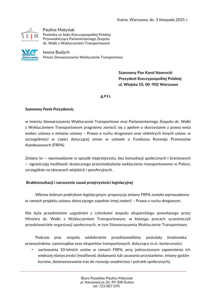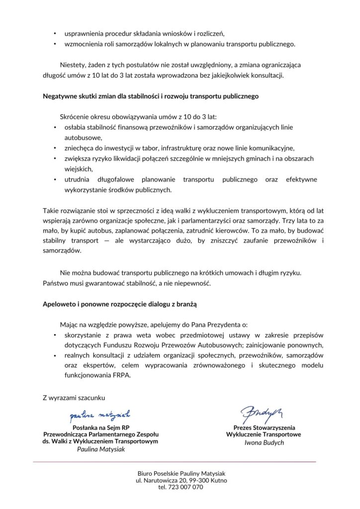 Decyzja Prezydenta jest jasnym sygnałem: nie ma zgody na rozwiązania, które zmniejszałyby dostęp mieszkańców do transportu publicznego i utrudniały rozwój przewozów autobusowych w mniejszych gminach.